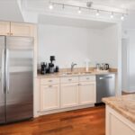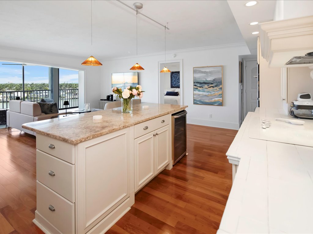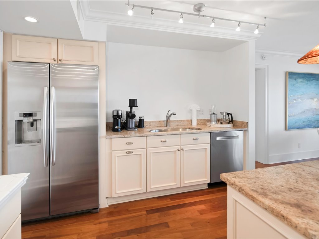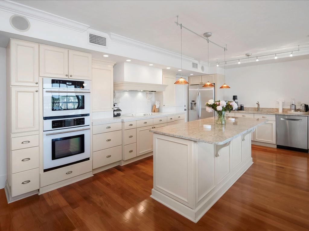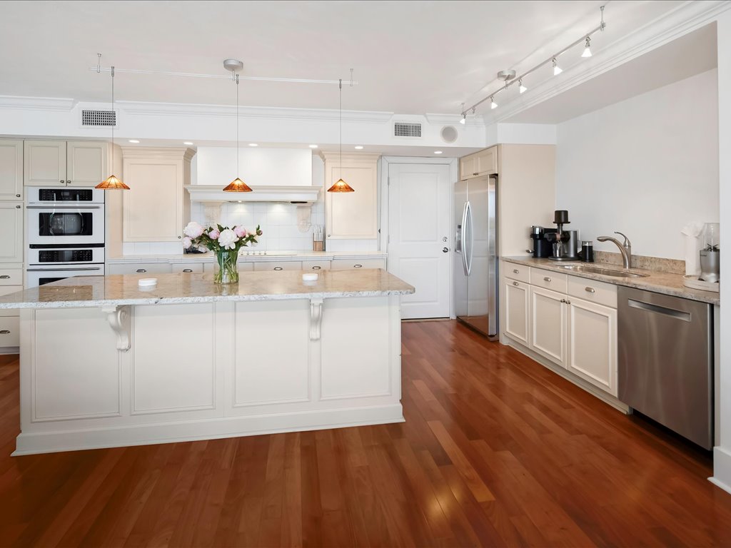 Treten Sie ein und entdecken Sie eine sonnige und einladende Wohnung mit neuen Möbeln und warmen Holzböden. Genießen Sie die voll ausgestattete Küche mit Edelstahlgeräten, Weinkühlschrank und viel Arbeits- und Stauraum.